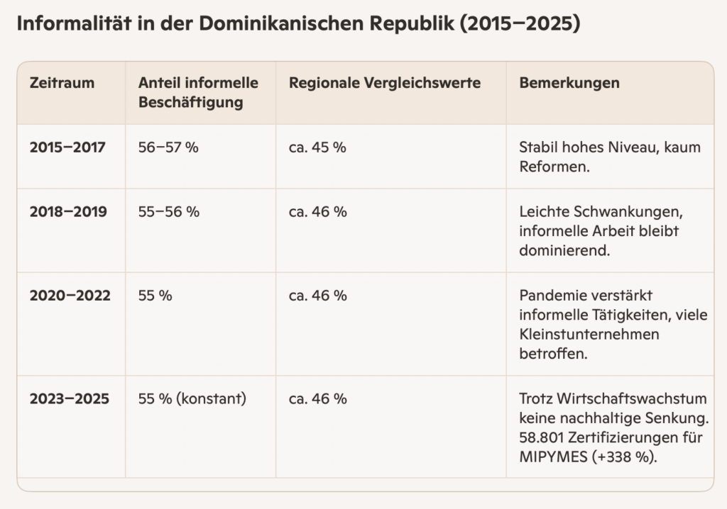 SANTO DOMINGO,– Die Regierung der Dominikanischen Republik hat eine breit angelegte Initiative zur Bekämpfung der Arbeitsinformalität eingeleitet. Nach Angaben des Ministeriums für Industrie, Handel und Mipymes (MICM) bleibt rund 55 Prozent der Erwerbsbevölkerung außerhalb des formalen Arbeitsmarktes – ein Wert, der deutlich über dem regionalen Durchschnitt von 46 Prozent liegt.