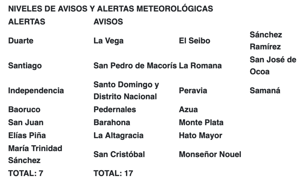 Das Dominikanische Institut für Meteorologie (INDOMET) erklärte seinerseits, dass Überschwemmungen in der Dominikanischen Republik „unmittelbar bevorstehen“ weshalb 17 Provinzen aufgrund der Gefahr von Überschwemmungen in Städten und ländlichen Gebieten, Überflutungen von Flüssen, Bächen und Schluchten sowie Erdrutschen, vor allem in gefährdeten Gebieten, weiterhin unter Wetterwarnung und -alarm stehen, wie aus der folgenden Tabelle hervorgeht: