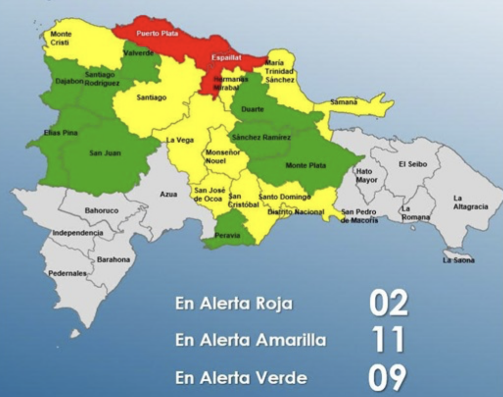 Santo Domingo.- Das Zentrum für Notfalloperationen (COE) hat am Donnerstag für Puerto Plata und Espaillat die höchste Alarmstufe Rot ausgerufen. Elf weitere Provinzen – darunter das Distrito Nacional – stehen auf Gelb, neun weitere auf Grün.
